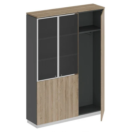 Шкаф состоит из шкафа для документов со стеклом, узкого шкафа для одежды под общим топом и цоколя на 2 шкафа.