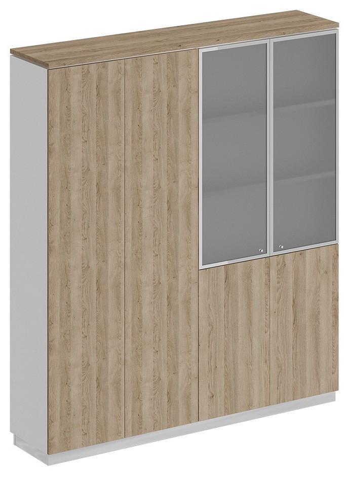 Шкаф состоит из шкафа для документов со стеклом и закрытого шкафа для документов под общим топом, цоколя и дверей.