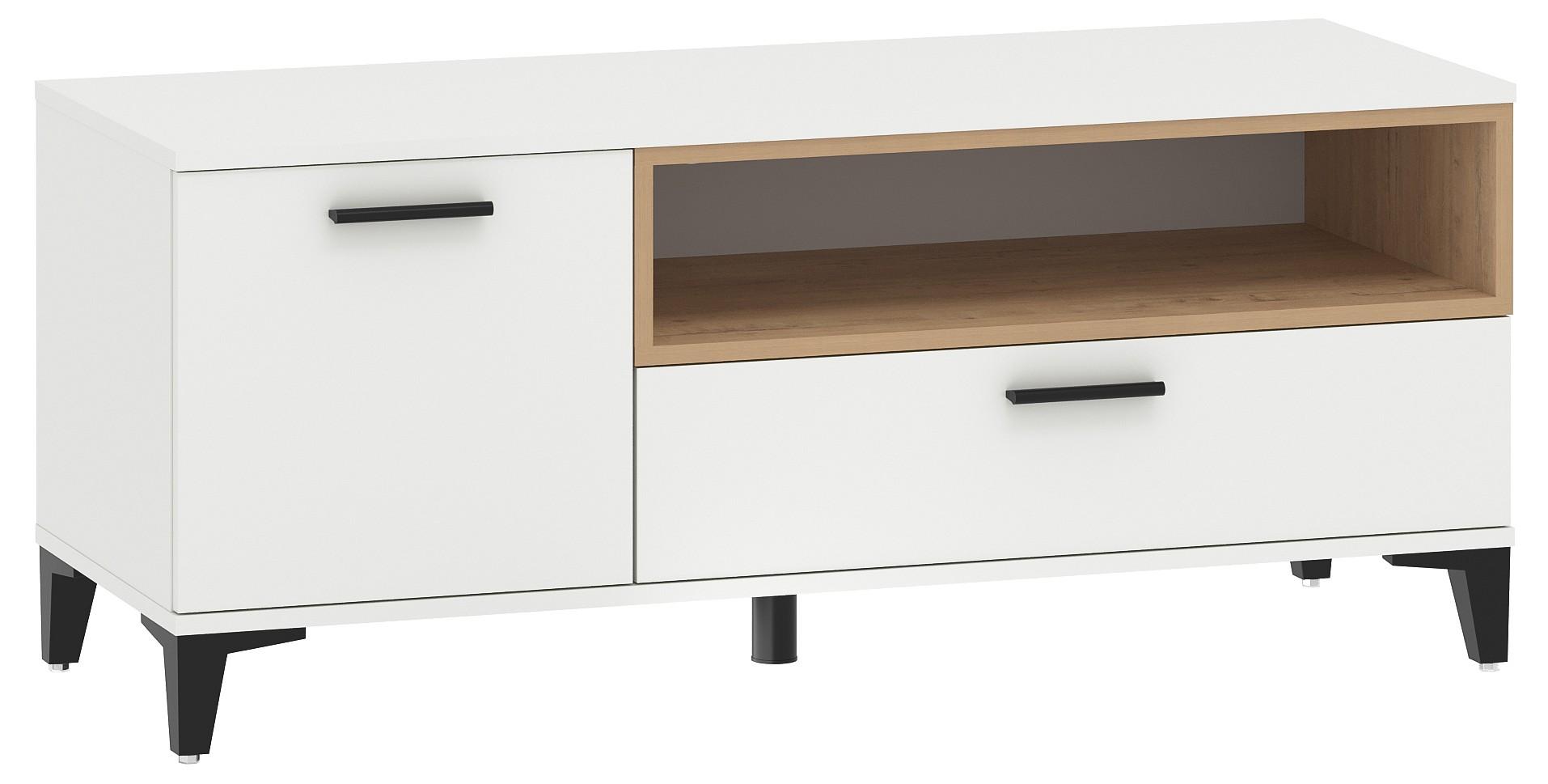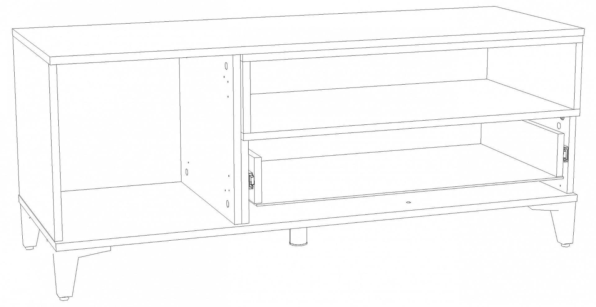 Тумба под ТВ с выдвижным ящиком на шариковых направляющих, с распашной дверцей и открытой полкой. Сборка универсальная.