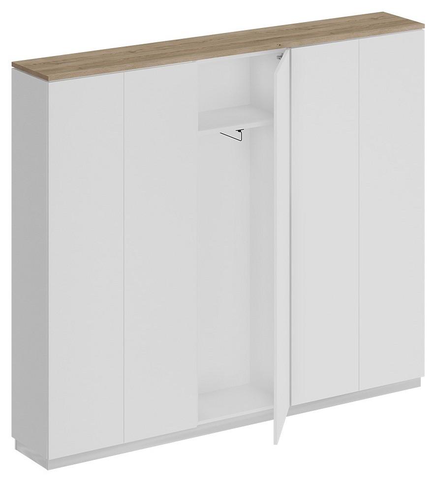Дизайнерским решением является зазор 8 мм между топом и боковыми стенками корпусом шкафа. Проемы между полками обеспечивают размещение стандартных папок CORONA высотой 320 мм. Шкаф для одежды укомплектован фиксированной по высоте полкой под головные уборы и выдвижной штангой для одежды. Конструктив шкафа для одежды позволяет установить дверь в левом/правом положении. Изделие укомплектовано пятью дверями из ЛДСП без замка с системой открывания Push To Open (без ручек).