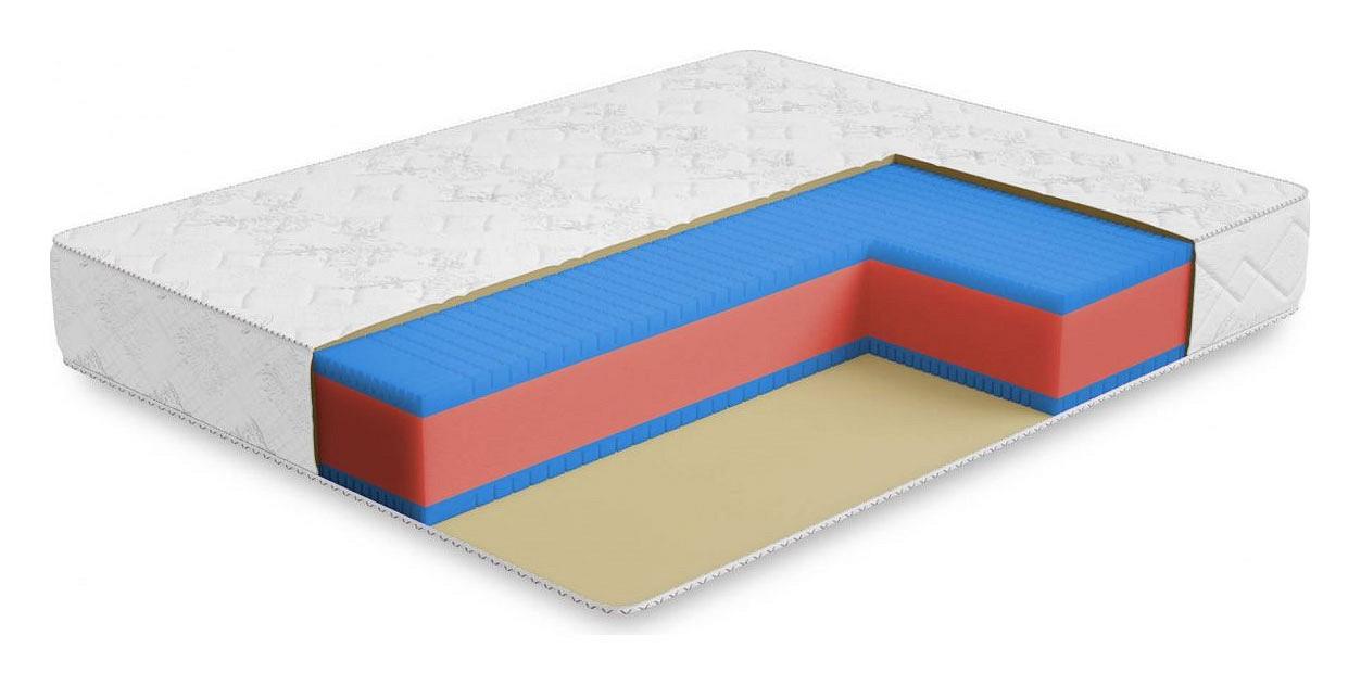 Беспружинный матрас отличается тем, что его структура позволяет точнее повторять контуры тела спящего, в отличие от пружинных матрасов, в которых точность подстройки ограничена диаметром пружины. В данном матрасе используется два вида современной пены, одна из них обладает средней жесткостью и принимает на себя все нагрузки, вторая пена обладает большей плотностью, но при этом она мягче, что придает одной сторон уникальные свойства, обусловленные сочетанием этих пен. Матрас очень легкий и подойдет для кроватей с подъемным механизмом, а также отлично ляжет в кровати с не высокими бортами. Может использоваться в детских или молодежных кроватях.