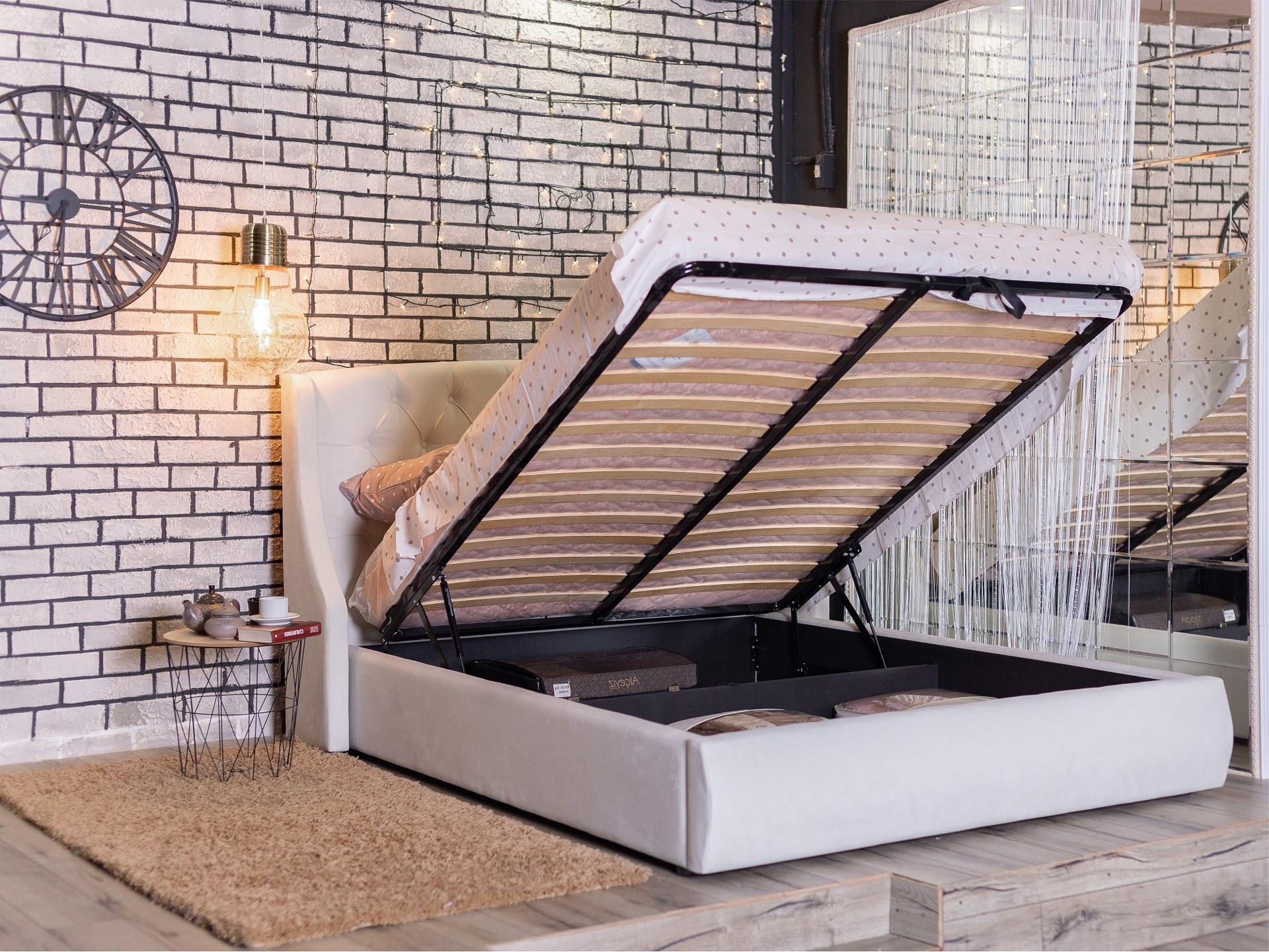 Ценители прекрасного поистине оценят мягкую интерьерную кровать Stefani из ткани с подъемным механизмом и высоким изголовьем.
