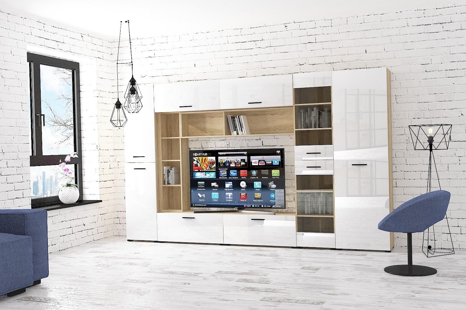 Гостиная сделана из ЛДСП класса Е1 ведущего европейского производителя, фасады из экологичного МДФ, покрыты ПВХ глянцевой пленкой.