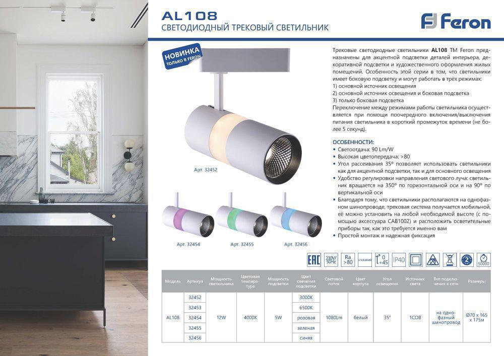 Светодиодный светильник Feron AL108 трековый на шинопровод 12+5W, 35 градусов, 4000К и подсветка синяя